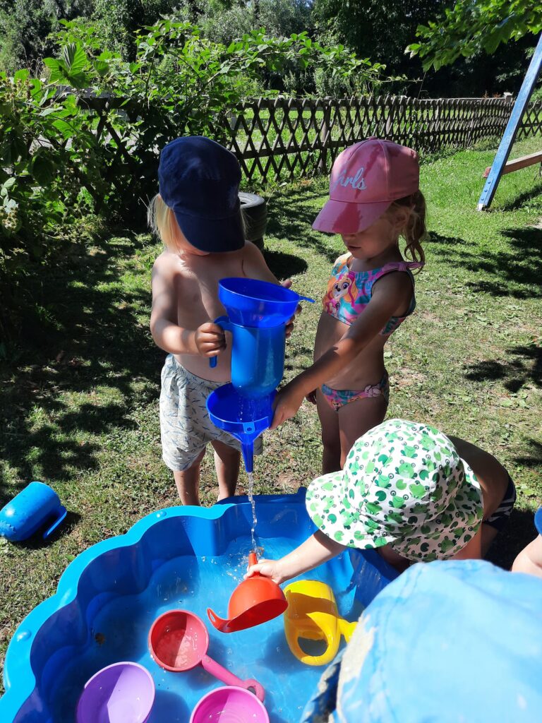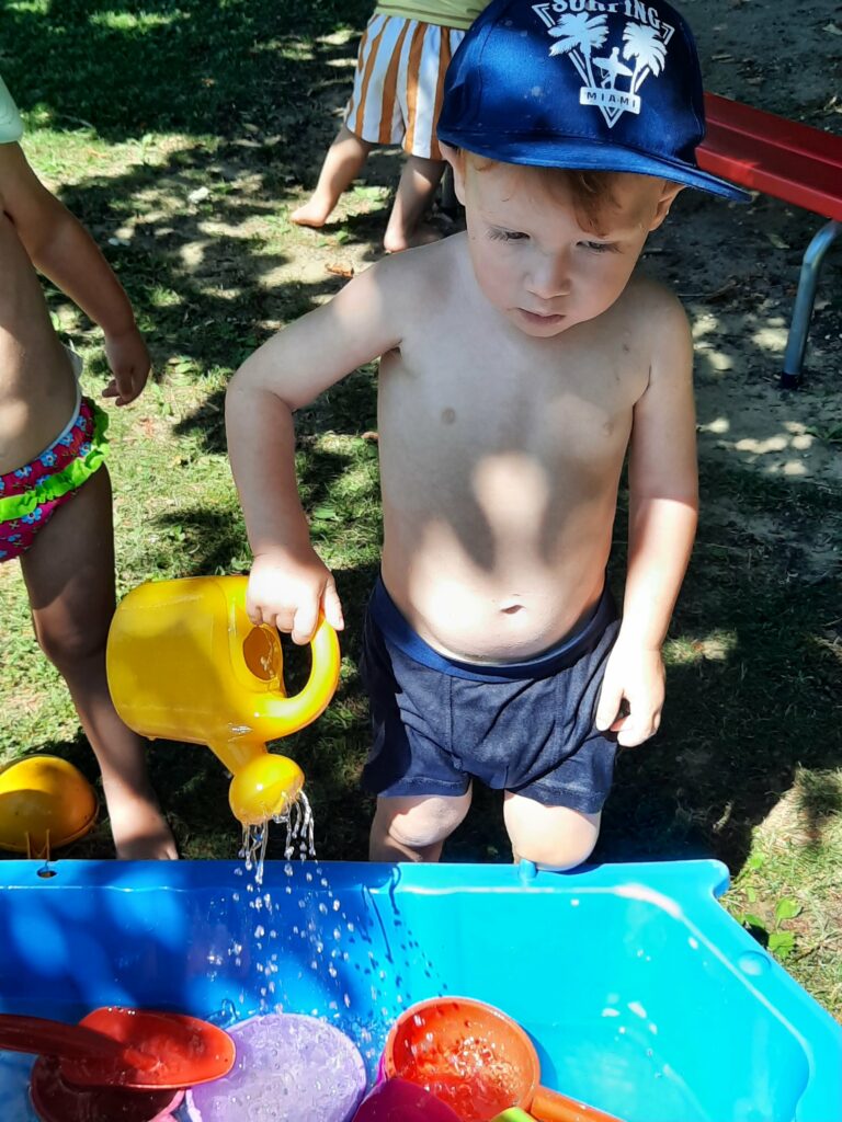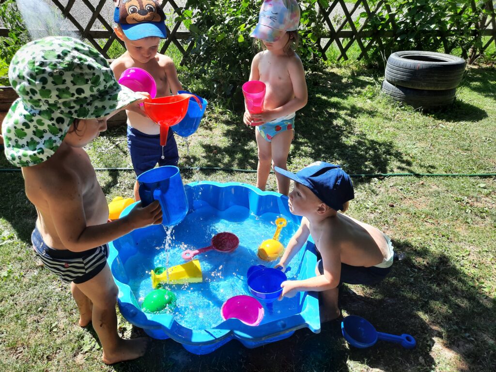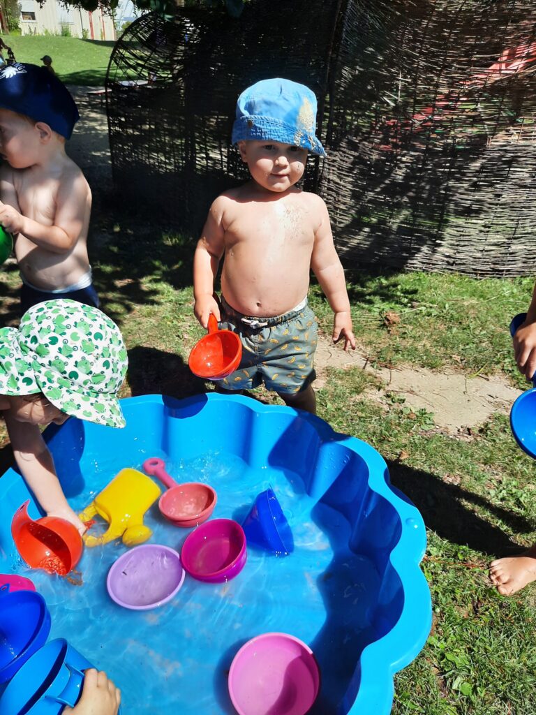 Wasserplantschen macht einfach Spaß! Ob mit Bechern, Gießkannen, Spielzeugen oder bloßen Händen konnten die Kinder sinnliche Erfahrungen machen. Ist das Wasser kalt oder warm? Wie fühlt es sich an, wenn man nass gespritzt wird? Was passiert, wenn man etwas drückt, rührt oder mischt?