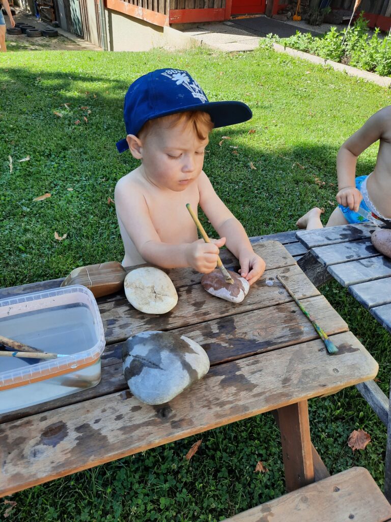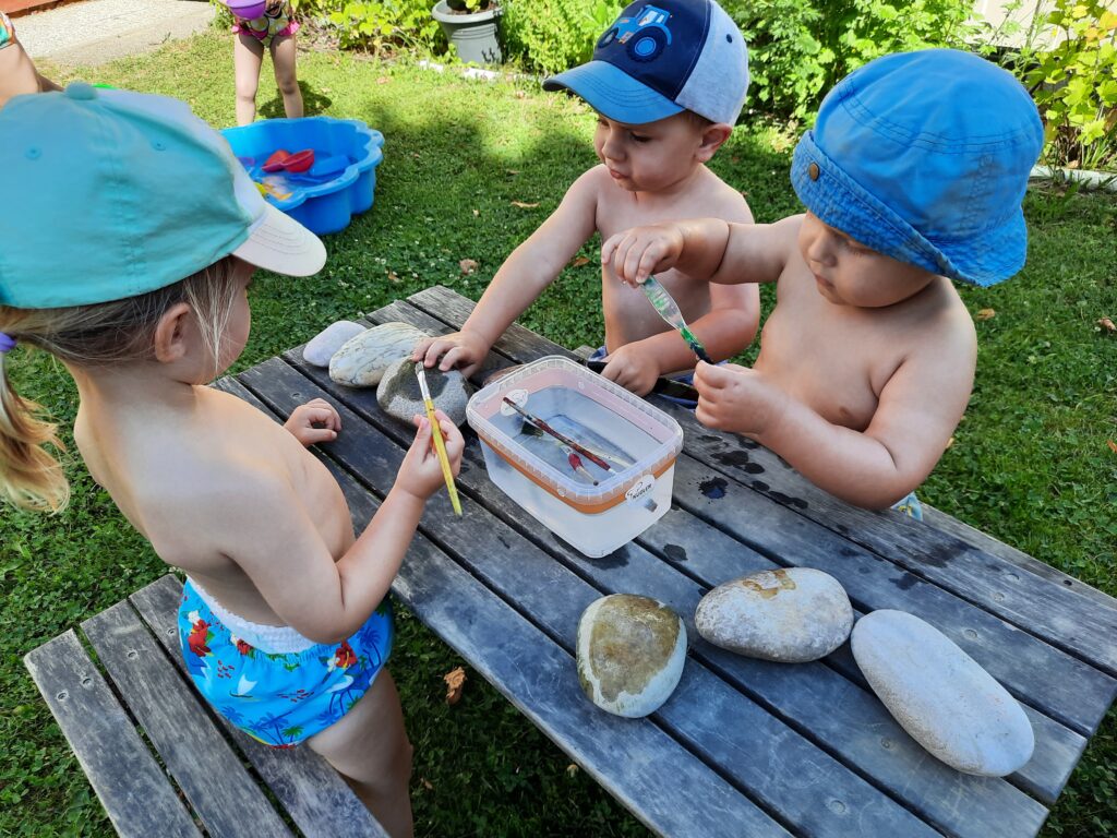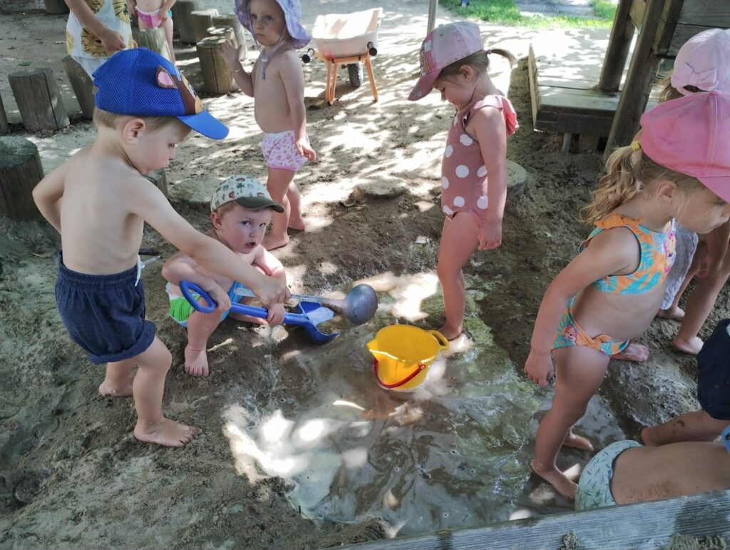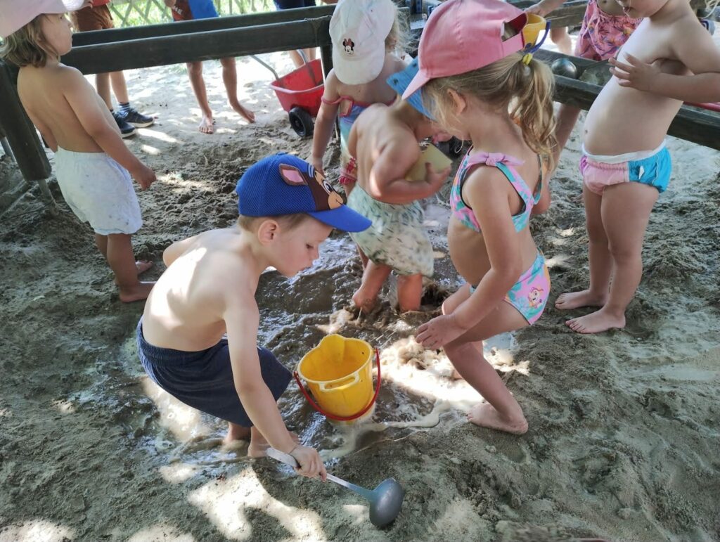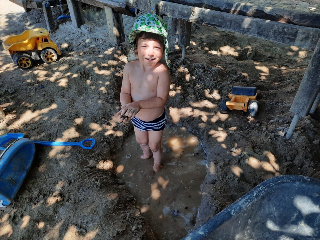 Die Kinder liebten es zu "Gatschen" und dabei die Erfahrung zu machen, wie sich Sand, "Gatsch" und Wasser auf der Haut anfühlt. Gemeinsam konnten die Kinder lachen, experimentieren und sich nebenbei abkühlen.